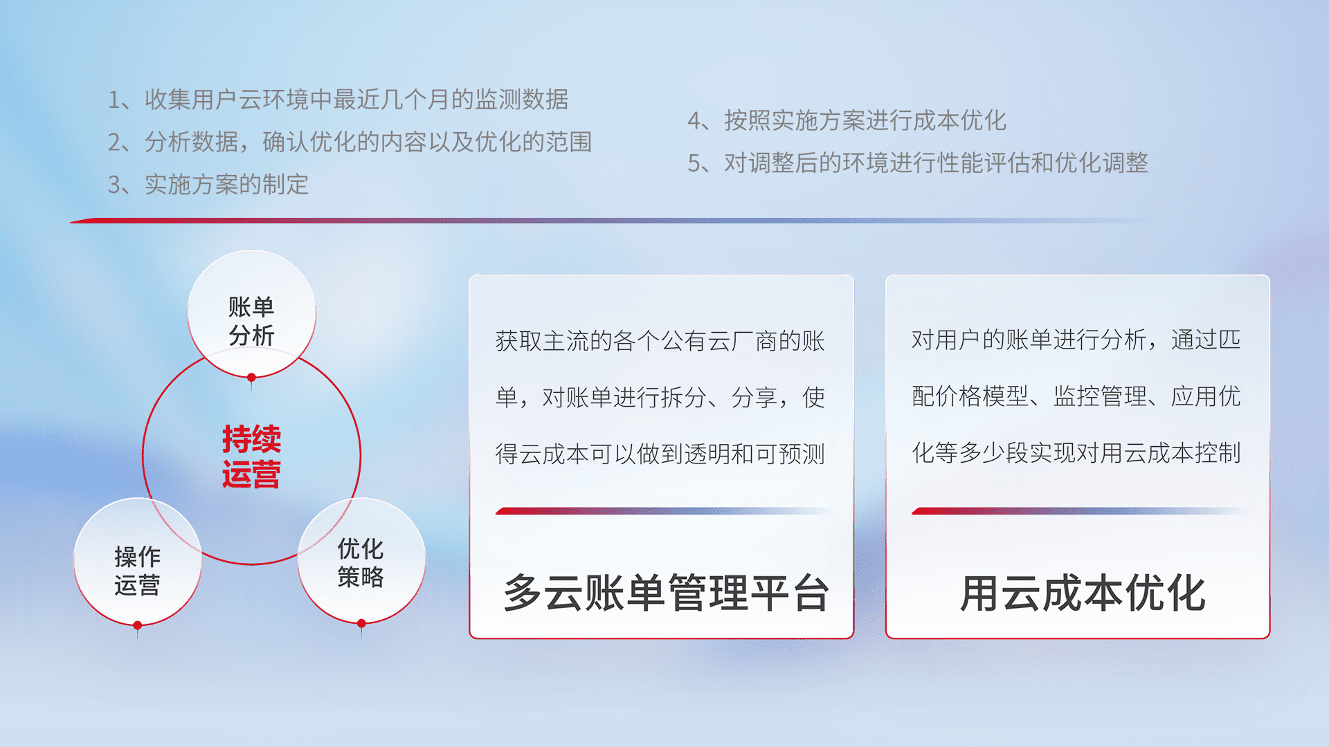 通过多云纳管,,,,以统一的资源数据模型把客户的云资源进行抽象和封装,,,进而实现对多云资源的统一操作,,保障云资源管理的可靠性、、、、稳定性与可用性。。。量身定制化运维内容,,,配置、、、、开发运维、、补丁管理、、、备份、、、、监控、、认证和访问管理、、、审计和日常巡检等,,保障在用云过程中的可靠度,,,稳定度以及高可用率。。。